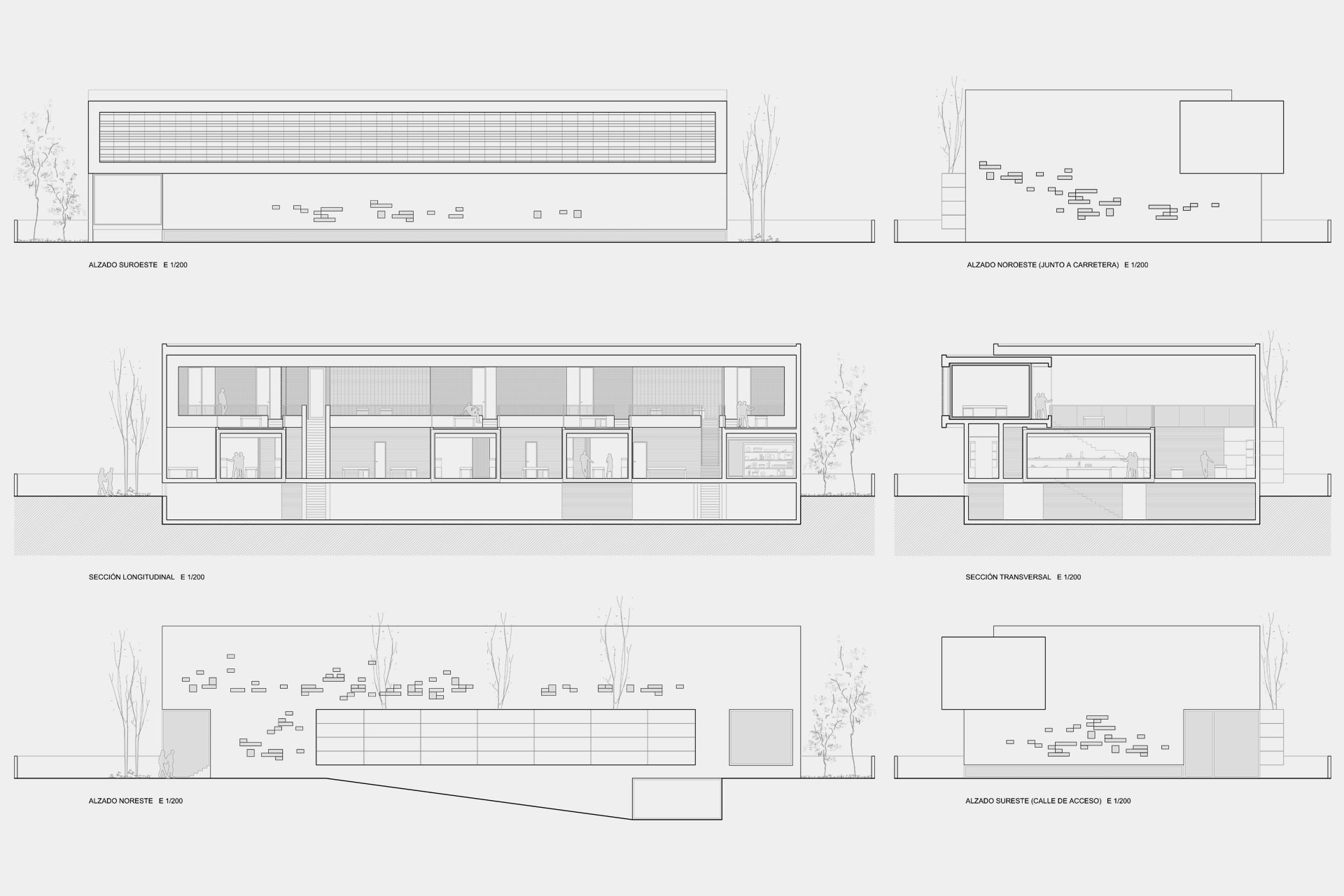 Las Oficinas Paco Gil en Elda organizan salas de muestras, espacios de trabajo y servicios dentro de un contenedor masivo y horadado. El proyecto parte de un solar inserto en un entorno industrial, con escasa posibilidad de relación directa con el exterior. Sin embargo, la propuesta no niega esa condición. Al contrario, la asume y la transforma en una lógica espacial propia. De hecho, son los patios de luz, las transparencias veladas y el control riguroso de la sección los que convierten la limitación del solar en el argumento del proyecto.