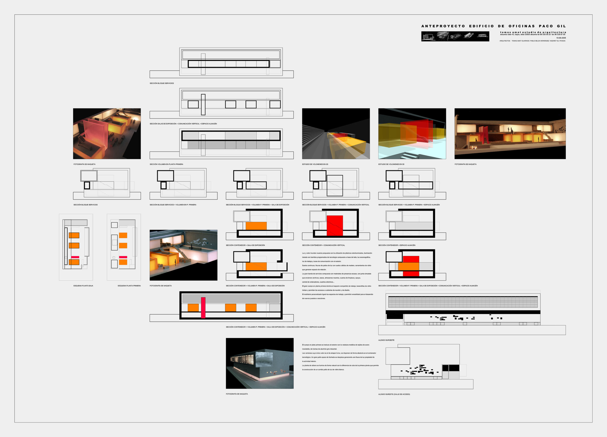 La operación decisiva consiste en introducir un conjunto de cajas programáticas de color dentro del volumen principal. En las maquetas, estas piezas se identifican con claridad: roja para la sala de muestras, ámbar y amarilla para las áreas de trabajo. Además, los vacíos entre ellas no son espacios residuales. Por el contrario, funcionan como intersticios reguladores que articulan recorridos, pausas y relaciones visuales. En consecuencia, el proyecto no se limita a albergar actividades: las jerarquiza y las hace legibles.